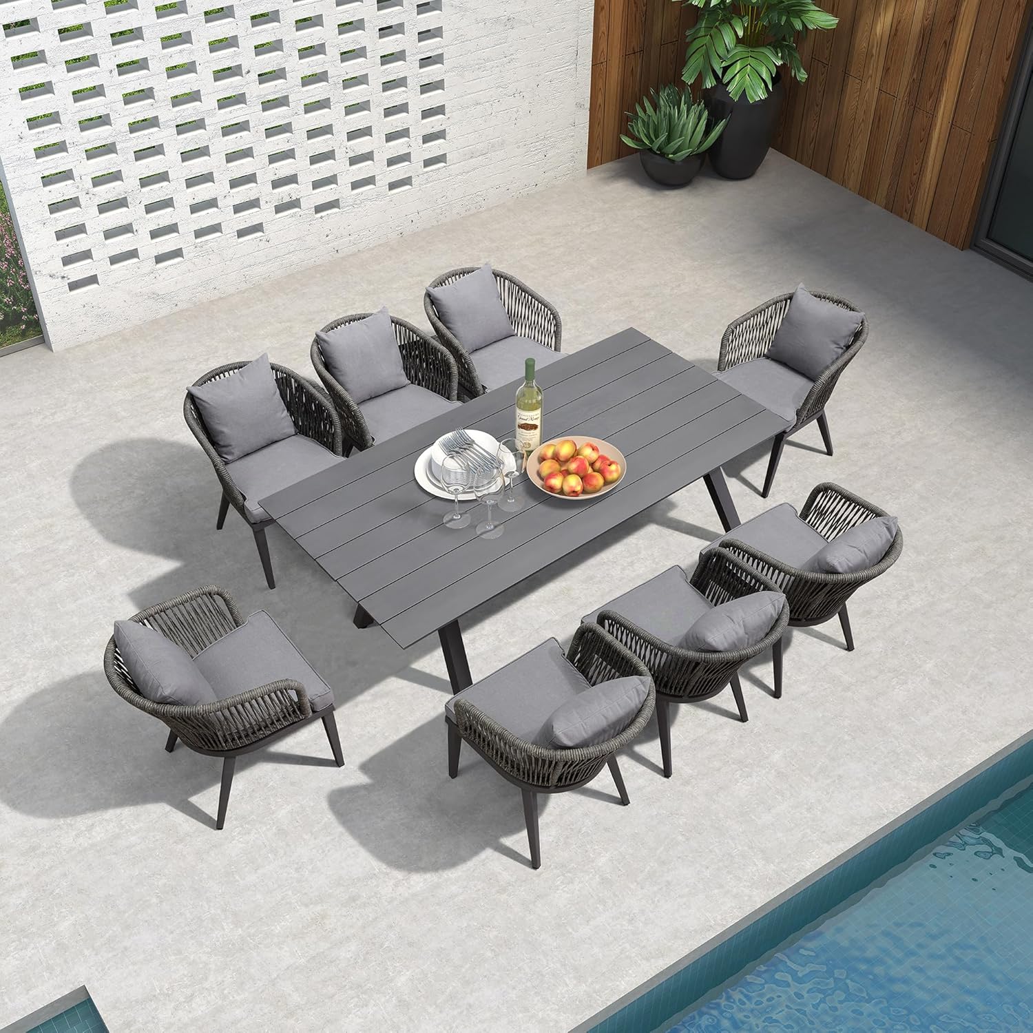 PURPLE LEAF 8 Person Outdoor Aluminum Garden Lounge Set, 9 Piece Garden Furniture Set, Modern Style in Grey, Rectangular Table with Rattan Chairs, Cushions and Pillows for Balcony