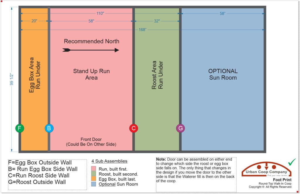 We calculate hen population based on ~4 ft² per bird run space (free range by Gov’t standards) adequate roost bar space, egg box space, and quantity and number of feed and water units. You add extra space because you’re being extra generous on space, or you’re adding room for extra hens in an optional configuration. Dimensions: Run Area: 110″W x 99.5″L x 90″H Roost Area: 32″W x 100″L x 68″H Sun Room adds 58″ Making it 168″ W Overall Height 90″ Weight: Fully Assembled ~700 + lbs. (weights given are for fully dry wood) Chicken Capacity: Averaged sized hens… Up to 20 ( sun room would allow for more if you wanted) Shipping: DIY/Contractor Kits 1 53x44x60, 900 lbs semi-crate delivered to accessible area via motor freight. 1 Box: 107x27x3, 100 lbs (single length roof metal) Design Concept & Key Points