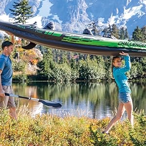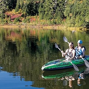 Including a handy repair set, 2 aluminum paddles, an inflatable pump