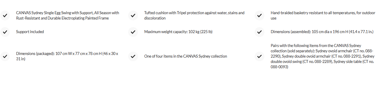 Add a fun and comfortable seat to your outdoor space with the CANVAS Sydney Single Egg Swing with Support. Unique patio swivel chair with a steel frame with a powder and electroplating finish to resist rust and weather, for added durability. Simple egg swing designed for outdoor use and made of weatherproof hand-braided wicker with stylish open weave. Wicker swing with a TRIPEL treated padded cushion to protect it from rain, stains and discoloration caused by the sun. Steel swing which is the perfect place to relax or enjoy a book while gently swaying. Steel swing including a safety strap to attach the chair to the support and prevent excessive tipping. Swing supplied with the stand having a maximum capacity of 225 lbs. Swing to be assembled and measuring 41.4" D x 77.1" H. This charming outdoor swing pairs with other furniture from the CANVAS Sydney collection to help you create a harmonious décor for your outdoor space: CANVAS Sydney egg chair (0882290), Sydney double egg chair (0882291), Sydney egg swing (0882289) and Sydney side table (0880093) sold separately.