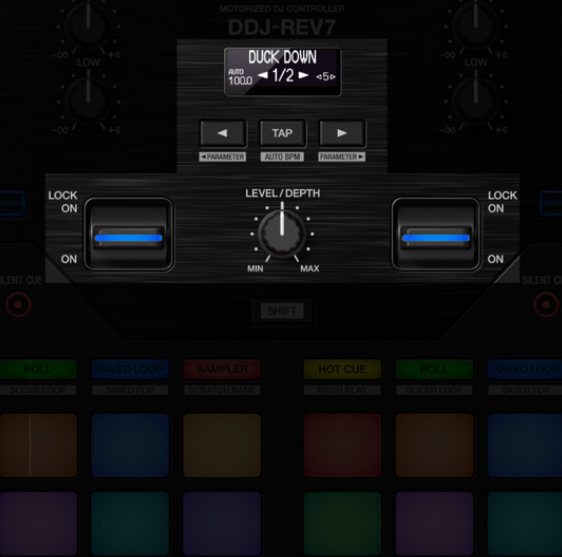 You can also pull the effects levers down and hold them to apply effects from Serato DJ Pro in short bursts, or push them up to lock effects on and free up your hands for scratching or track browsing.
